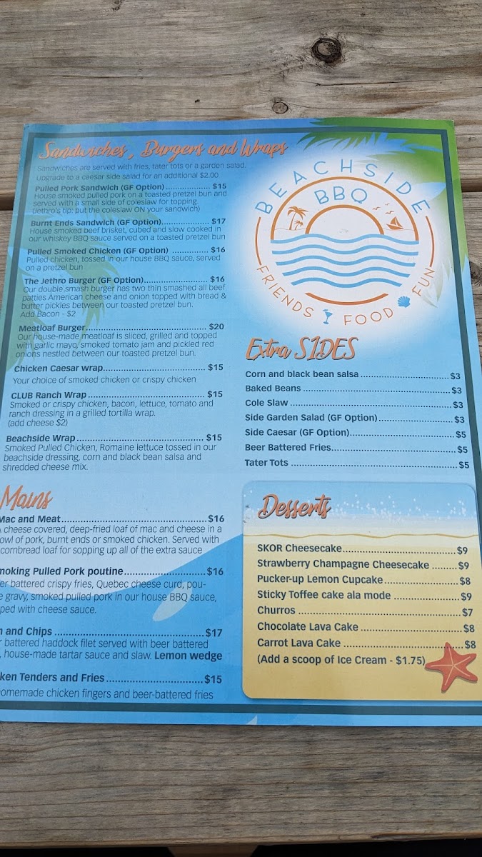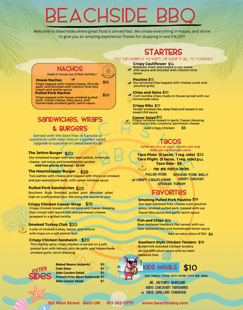 Welcome to Beachside BBQ, a vibrant spot nestled at 352 Main Street, Bath, ON. Their menu features mouthwatering favorites perfect for any palate. Indulge in the Smoking Pulled Pork Poutine, a savory delight, or savor the classic Fish and Chips. For those seeking comfort, the Southern Style Chicken Tenders will surely hit the spot.